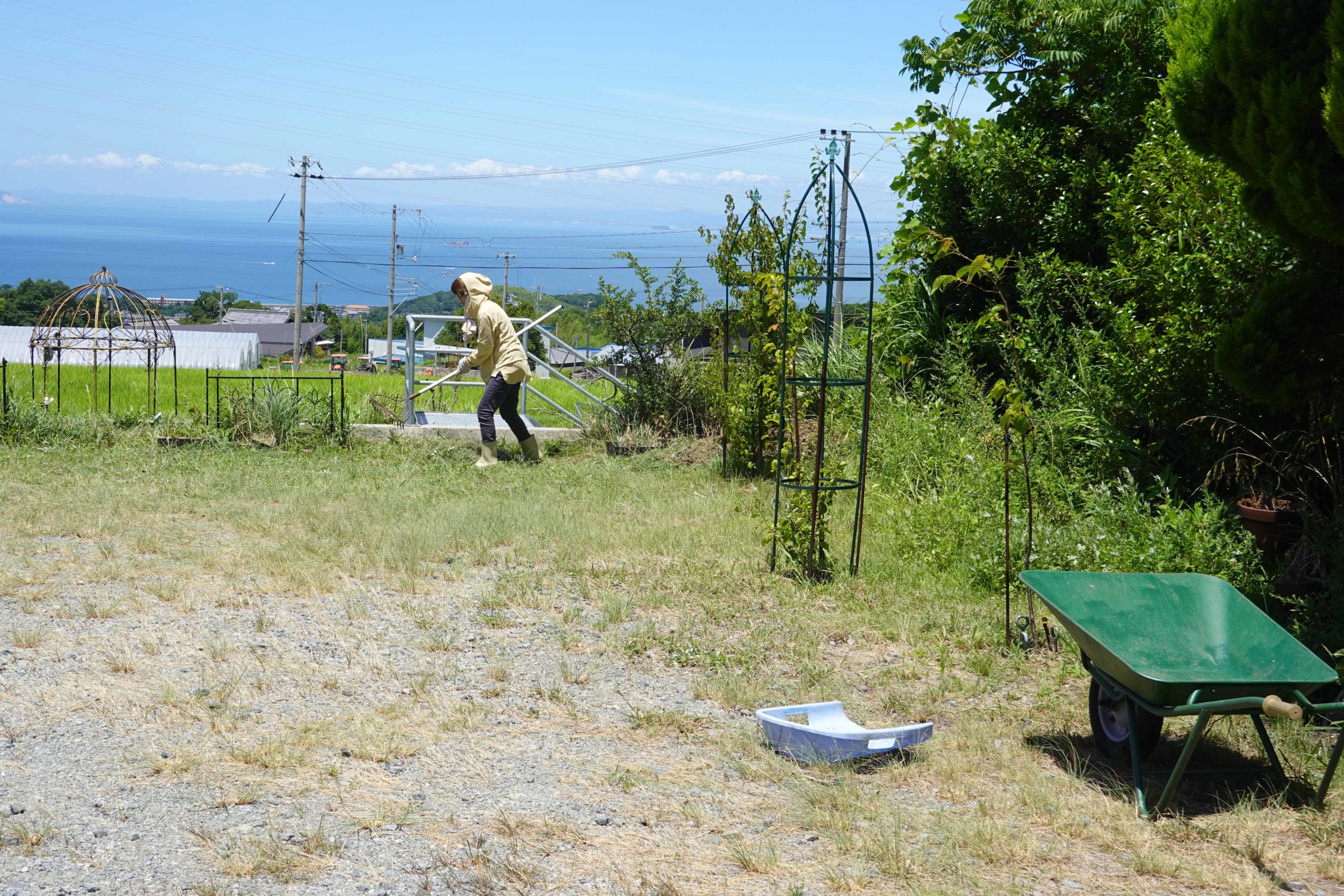 毎日35度以上の気温 2025/07/25 チロの日記 青空が広がりもうすぐ初盆(8月3日)になります ヤギさんたちも草を刈ってくれているのですが、それは牧草地だけの話 「まち」より体感で2℃ほど涼しい山肌のチロの日記は敷地内の舗装してないところは刈った端から草は伸びてきます、作ろうとしても「作物」はなかなか思い通りにならないのにね スタッフさんがお葬式の合間に草刈り集めをしてくれています